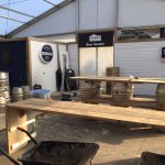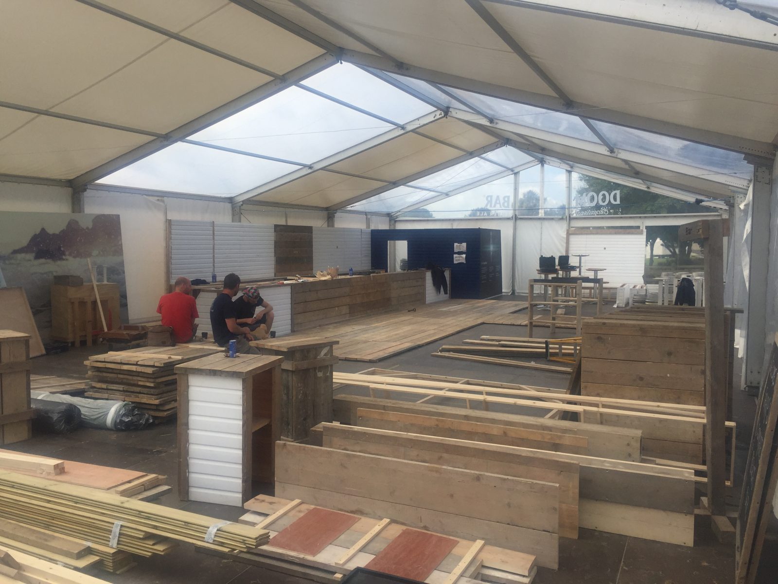 If you work in events, you know the weather is never predictable, and sure enough we were hit by bouts of rain. Wet conditions not only create health and safety issues, they also present problems when trying to build bespoke bars. Soldiering on, Trinity Set & Stage took advantage of key dry times, in order to create this years bespoke bar and entrance structure for Sharp’s Brewery.