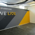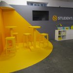 Silicon Milkroundabout is a recruitment exhibition held every year for businesses to find tech savvy employees to join their teams. To be installed at the Old Truman Brewery we were asked to build a stand like no other for Student.com, a company who helps students find accommodation around the world. The exhibition stand included branded backdrops with TV screens, bespoke ‘LIVE’ desk, yellow furniture and props etc. Keeping with the brands yellow theme there was a light in the corner creating the illusion that everything it touched was yellow including a circular vinyl floor underneath, graphics backdrop and yellow furniture.